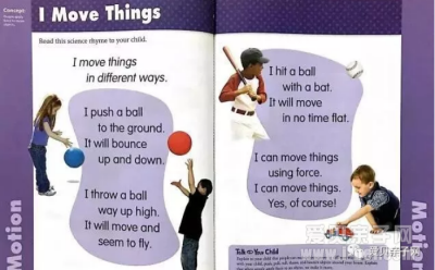 举个例子,这页来自 PreK年级,说的是关于 Motion (运动)的概念,用歌谣结合生活中的常见现象,孩子就很容易懂。