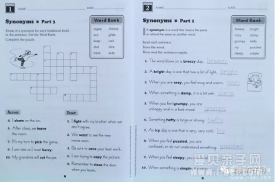 240 Vocabulary Words Kids Need to Know是美国某重点小学的词汇练习册,从Grade1到Grade6共六本,每本24个单元,每单元10个单词。围绕这10个单词有三页练习题,内容包括拼图游戏,同义词替换,句子填空。绝对不枯燥。