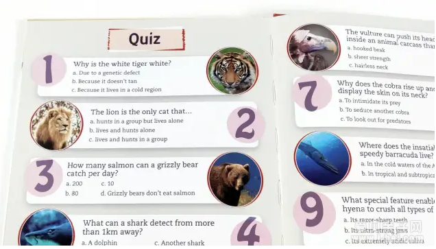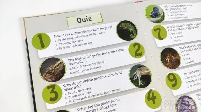 书中涉及到的动物覆盖了鸟类、鱼类、无脊椎动物、爬行动物和哺乳动物,提炼出了60个知识点,可以说是把一本动物百科以孩子的视角重新排列组合了。