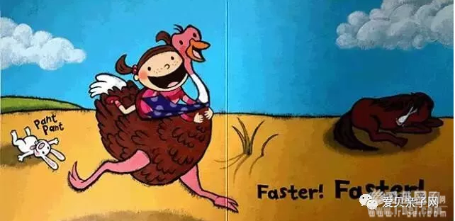 在她骑着兔子奔跑的时候,她们的后方是前面乘着的狗,前方是一只鸵鸟。这也暗示了下一页里面小宝宝乘着的动物是鸵鸟。