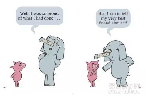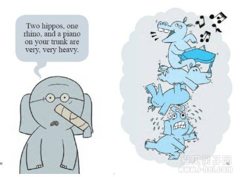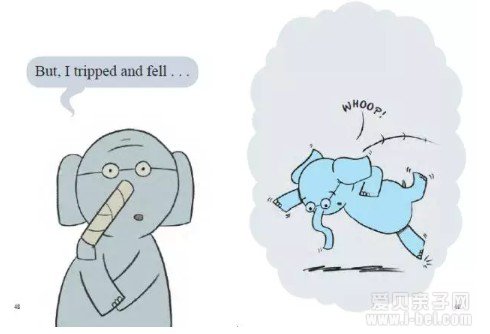 比如这本《I Broke My Trunk!》(长鼻子折了)。小象的鼻子折了,小猪问他为什么呢。小象不紧不慢地讲述了一个曲折离奇的故事。