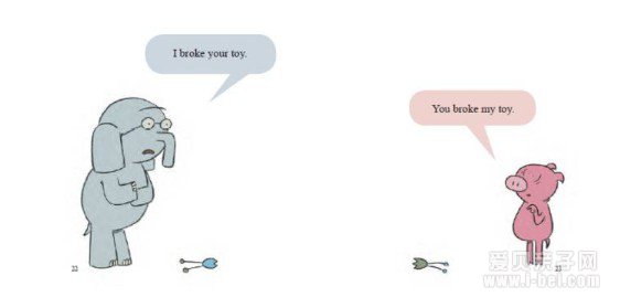 小象摔坏了小猪的玩具,小猪又急又气,两个人一起大哭。可当发现玩具其实并没有坏的时候,小猪问:“你还想不想玩我的新玩具?”小象却说:“我不想玩你的新玩具,我只想跟你一起玩。”