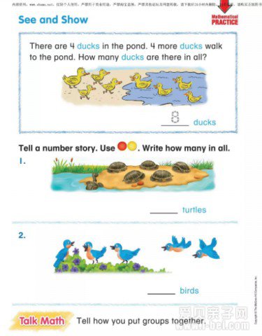 My Math每一章围绕一个核心主题,章前有预备测试。然后用一幅幅的图画、故事、动画、视频、儿歌、活动展开教学内容,无论大人孩子都会看得乐此不疲。章后有不同层次的习题供复习。