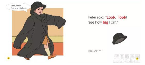 彼得穿上了爸爸的衣服,说:“看啊,看啊!看我多大啊。”