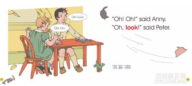 全书以美国小朋友彼得和安妮为主角,还有他们的爸爸、妈妈、奶奶、小狗、小猫,引出了10个小故事。故事内容非常的生活化,就是孩子们熟悉的跑一跑、跳一跳、吃饭、游戏等,贴近孩子生活且表达简洁,通俗易懂。
