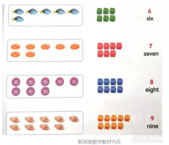 从图片上,我们可以明显看出,新加坡的数学教材没有选择在一开始就用图形或者数字,他们先用纽扣、鱼、糖果等实物的图片进行引导,这样会让孩子们觉得数学与他们所能接触到的真实世界距离很近。他们可能前一秒还在手上玩着纽扣,下一秒就看到了书上的纽扣图案,这样就不会一下子摸不着头脑。