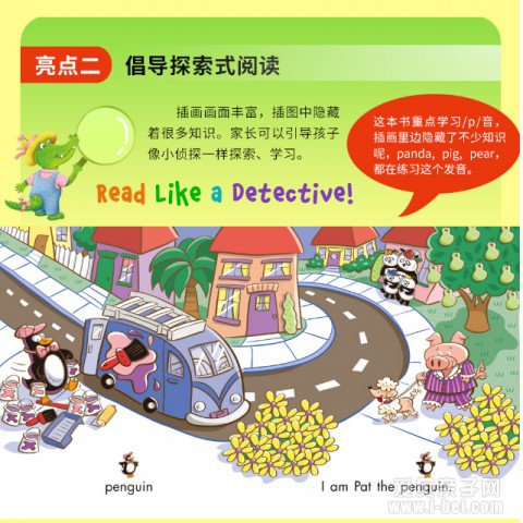 参照原版教师用书,编排科学用书指导 “培生英语·阅读街”参照原版书配套教学用书(Teaching Guide),为每册书设定了明确的学习目标,编排了趣味亲子游戏,并附有详细的词汇、短语和句型的解释,帮助克服阅读障碍,提高阅读效率,方便家长指导孩子学习。