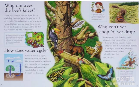 这套书里,主图一般是一幅精致的手绘仿真图 - 如实反映科学实景;周边配合几幅与实际生活关联的儿童漫画,帮孩子触类旁通,形象化地理解相关的知识。
