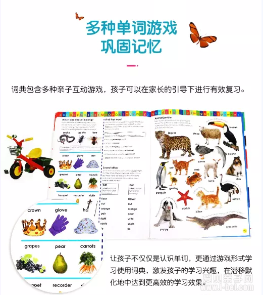 1、Dictionary Games(动物字母、记忆测试等)。词典最后附有多种亲子互动小游戏,解决爸爸妈妈不知如何有效引导和复习的困难。