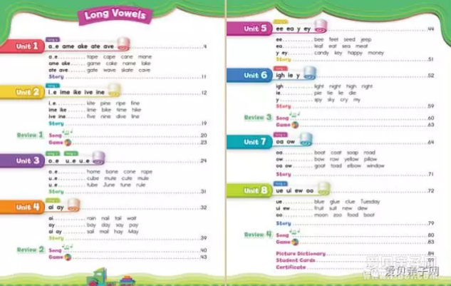 本级别共八个单元,四个复习单元。学习单元主要讲解a,e,i,o,u的长音及双元音的发音,还有对应的单词的学习,如:tape, kite,home, rain, blue等。