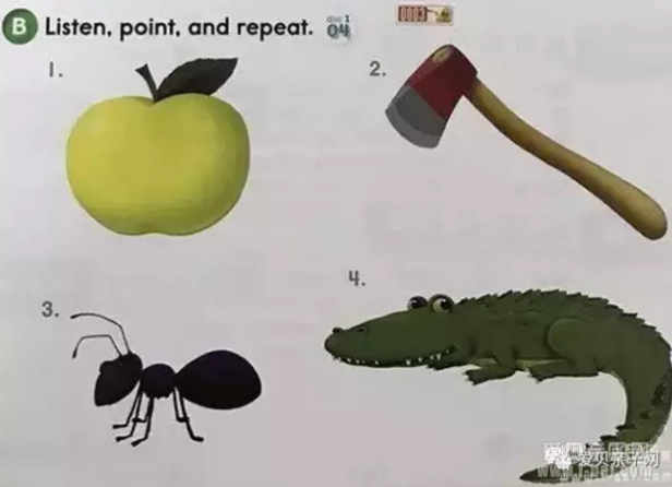 Listen, point and repeat听音辩音。认图并跟读,同时通过对应的图画,了解常见词的含义。