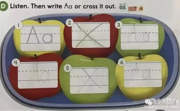 Listen. Then write Aaor cross it out. 相当于一个小测试进一步强化读音和书写,女声匀速读六个单词,娃听单词完成测试,在含有A字母发音的地方书写Aa;没有A音,就划个叉叉。现学现练,趁热打铁。