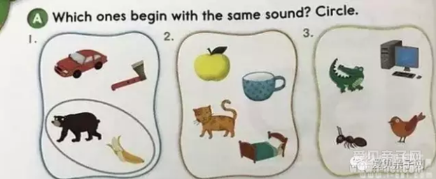 第一项是看图选物,孩子不需要掌握所有单词的发音和意思,只需将图中首字母发音相同的图片圈出即可。这项内容旨在巩固本单元学过的音素,内容相对较为简单。