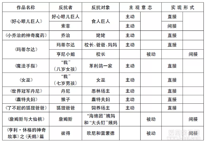 罗尔德·达尔的幻想儿童文学作品中,弱势一方对强势一方的“反抗”是作品的重要内容,有时推动情节发展,有时贯穿始终成为故事主线。如图所示他的作品“反抗”案例: