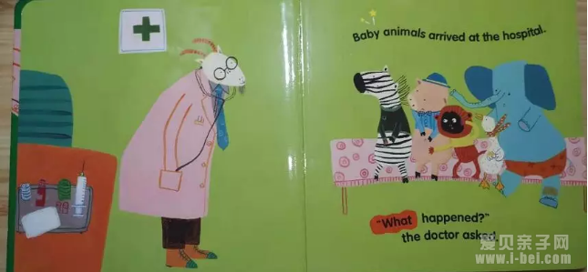 读到What happend 的时候,可以让孩子扮演医生,一个个指着小动物,用不同的声音来问小动物what happened.