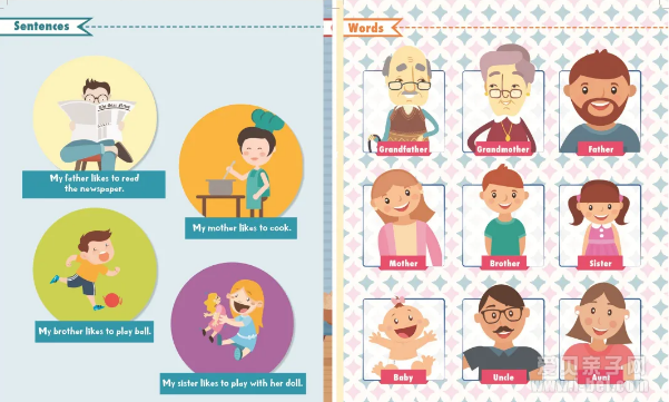 大量与日常生活息息相关的单词,像是孩子们感兴趣的颜色、动物、家庭、食物、交通工具......等等,都能让孩子在学习英语的同时认知事物,认知自我,认知生活。