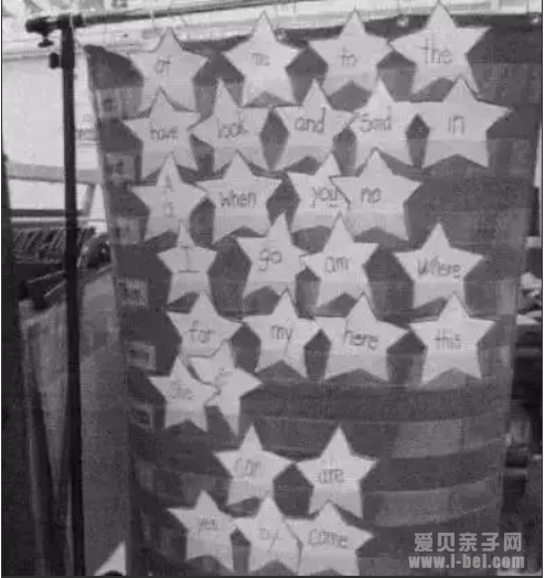 视觉词汇,比如 at, and, that, the, he, it, on, she这样的单词,孩子应该见词能读,无需分析字母发音。有的美国幼儿园把视觉词汇写在星形卡片上,并把卡片贴到布上,挂起来,方便小朋友记忆,如下图: