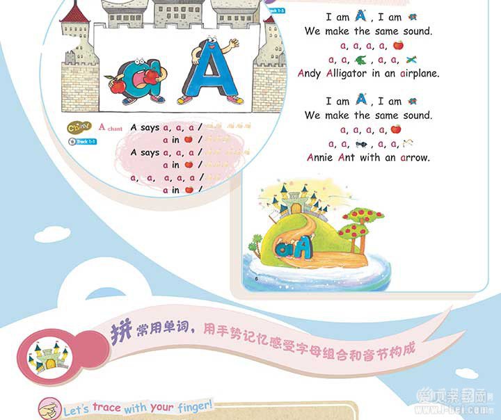 通过图画观察小a怎样变成大A,生动活泼地演示了字母的演变过程,本身就具有故事性和趣味性,画风可爱诙谐,而且歌曲中涵盖一个含a发音的主要单词,这就将自然拼读的学习融入于无形之中,让孩子在不知不觉的反复之中掌握了相对艰涩的内容。
