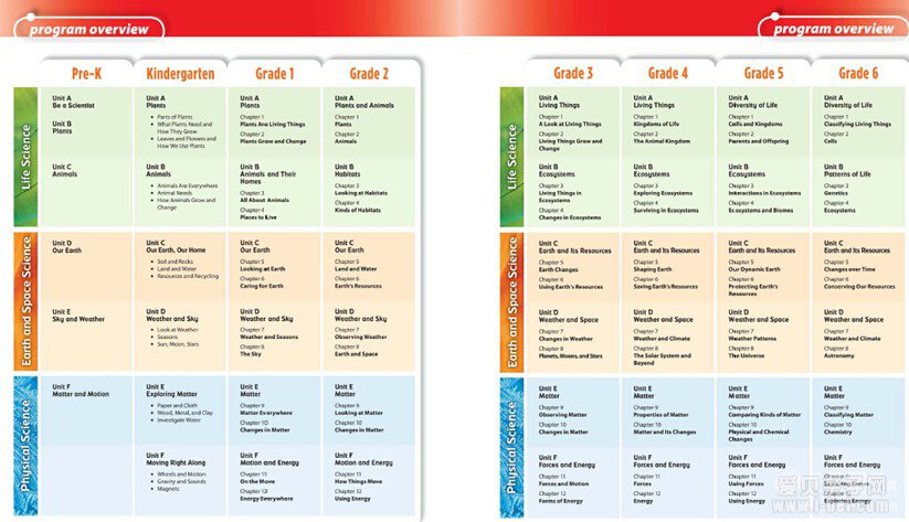 在教材的编写上,较为侧重对孩子们观察、推理、预测与交流、测量、定位、比较、分类、探究、举例和得出结论、阅读和运用图片、记录、搜集信息、使用工具等十三项能力的锻炼和培养;高年级更增加了观察和识图、问题和假设、用科学阅读、实验技术和信息识别、收集数据和数学能力、得出结论和科学记录、运用教材等能力要求。