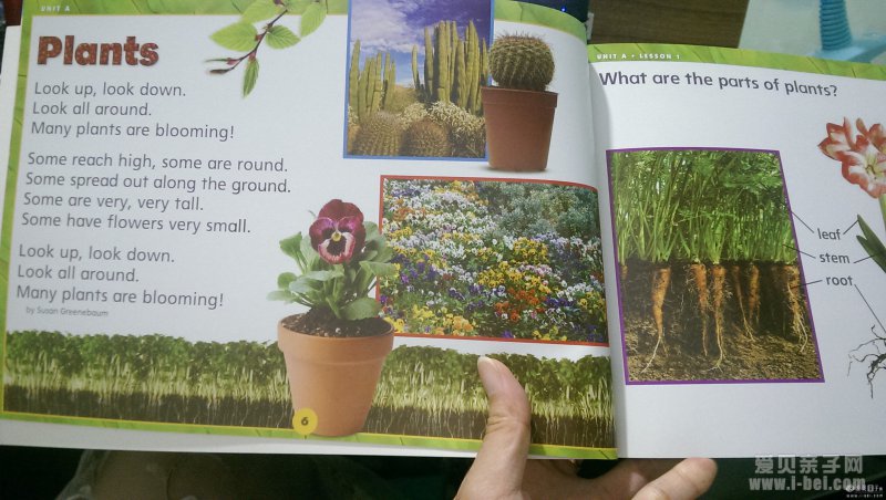 G5开始,加州科学关于植物内部结构的讲解更为深入。根、茎、叶的细胞结构,各部分结构的功用;植物的有性繁殖、无性繁殖,种子植物、被子植物;植物光合作用、呼吸作用的原理,已涉及到简单的化学知识。