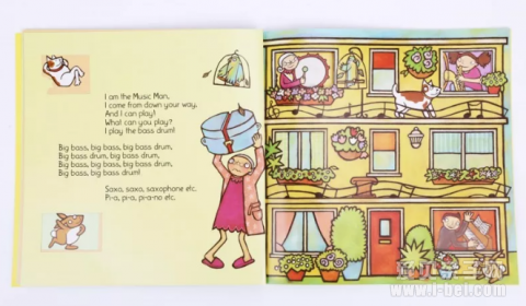 比如 I am the Music Man 这一册,每翻开一页,就像打开一扇新窗户一样,能看到一位新的音乐家在演奏新的乐器。这样的洞洞设计,能聚焦孩子的注意力,让孩子立马投入到对图像的观察和摸索当中。