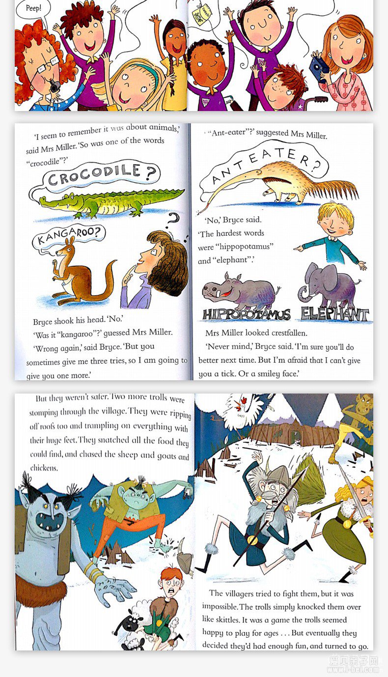 所以大多数分级读物都只能“照顾的了头,就照顾不到脚”。什么意思?如果要照顾语言难度,故事趣味性就要打折;如果故事要好看,就不太能兼顾语言学习。也就是说,要语言科学,又要故事有趣,实在太难了,而这套《图书馆》,就几乎做到了鱼与熊掌兼得,这也是Usborne图书馆系列独特的地方。