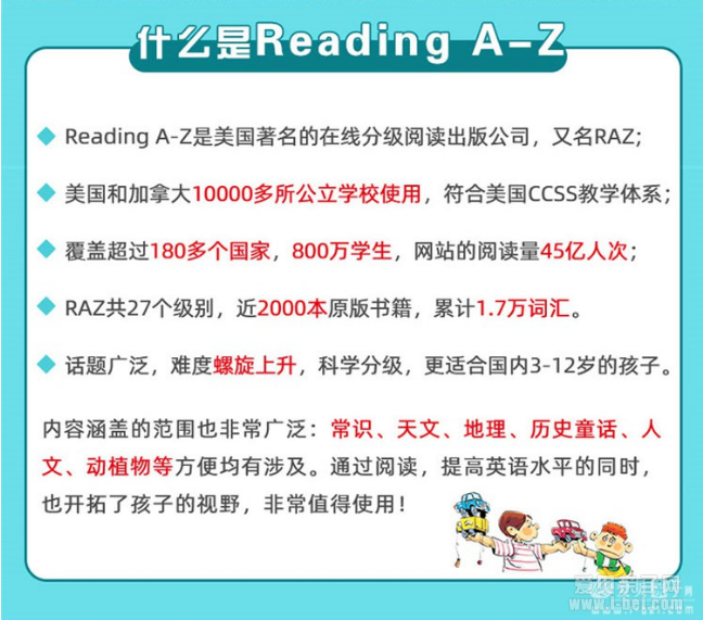 “Reading A-Z”,也是美国最为流行的英文分级阅读读物,有1万多所学校正在配合教学使用,中国北上广大部分知名国际学校也都把RAZ引进了教学体系!
