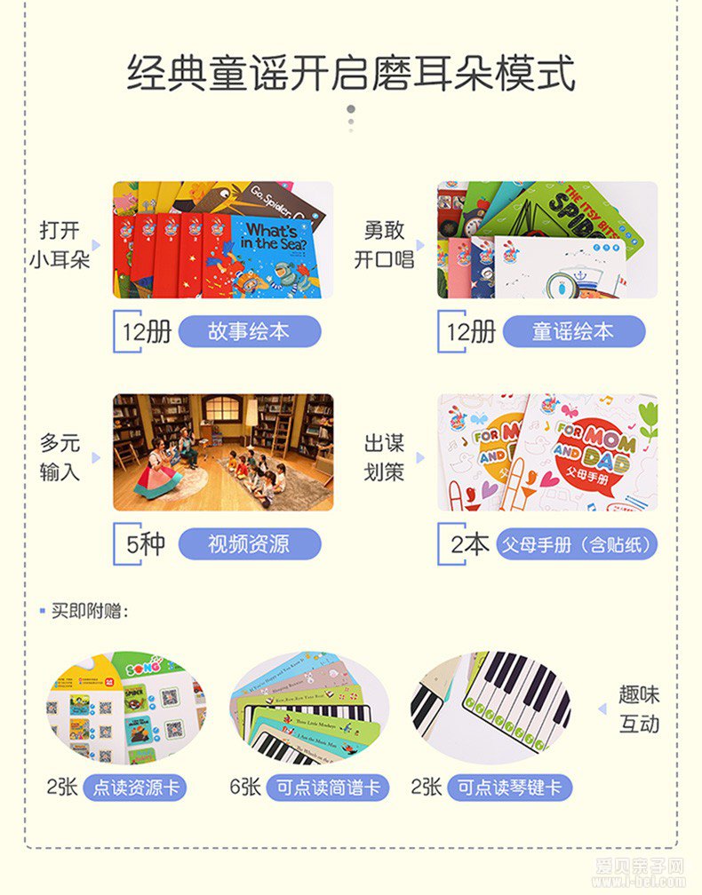 6 册童谣绘本、6 册故事绘本、1 本父母手册(含贴纸)和 1 张点读资源卡;
