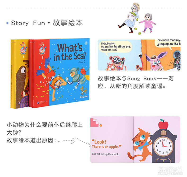 彩虹兔系列中的 6 本 Story Fun 是改编自童谣的主题故事书。简单的文字组成极具趣味的情节,让孩子在欢快童谣的记忆里,开始快乐轻松的阅读之旅。故事书通过对话的形式、用孩子已经熟悉的英文句子再现童谣中的每个情节。