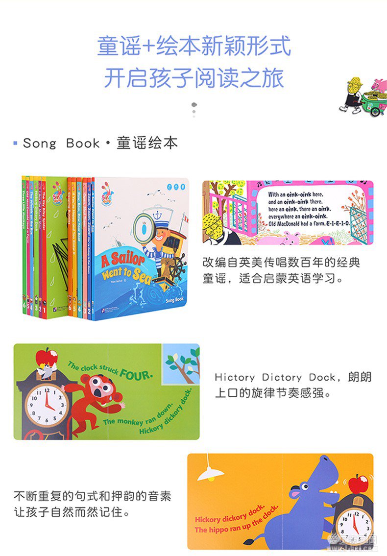 “Sing Along欢唱童谣”欢唱童谣,每首讲述一个生动有趣的故事。孩子能够在唱唱跳跳当中准确理解童谣的故事内容,并熟练掌握英文歌词中的词汇和句子表达。