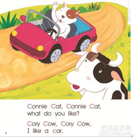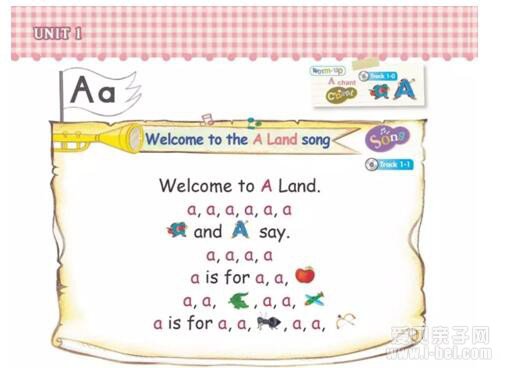 每个单元先以一首韵律儿歌开启新的学习过程,韵律儿歌反复、叠韵,适合孩子的学习兴趣和认知水平。欢迎来到B的地界,然后在儿歌中串联B开头的单词,banana、bear、bicycle、bee、ballon,这就将自然拼读的学习融入于无形之中,让孩子在不知不觉的反复之中掌握了相对艰涩的单词的拼读,帮助孩子建立字母到单词之间的语感和逻辑联系。