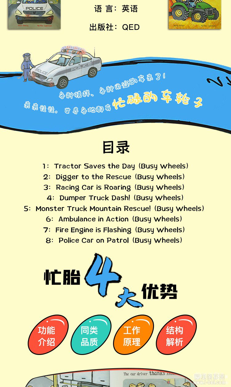 该套书专为学龄前儿童设计,以挖掘机、消防车、赛车、拖拉机、救护车、卸货卡车、巨轮卡车、警车等8种车为主角,每一辆车配以一个小动物解说员,让小朋友轻松地学到关于车的术语、零件名称以及各种噪音的知识等有用信息。