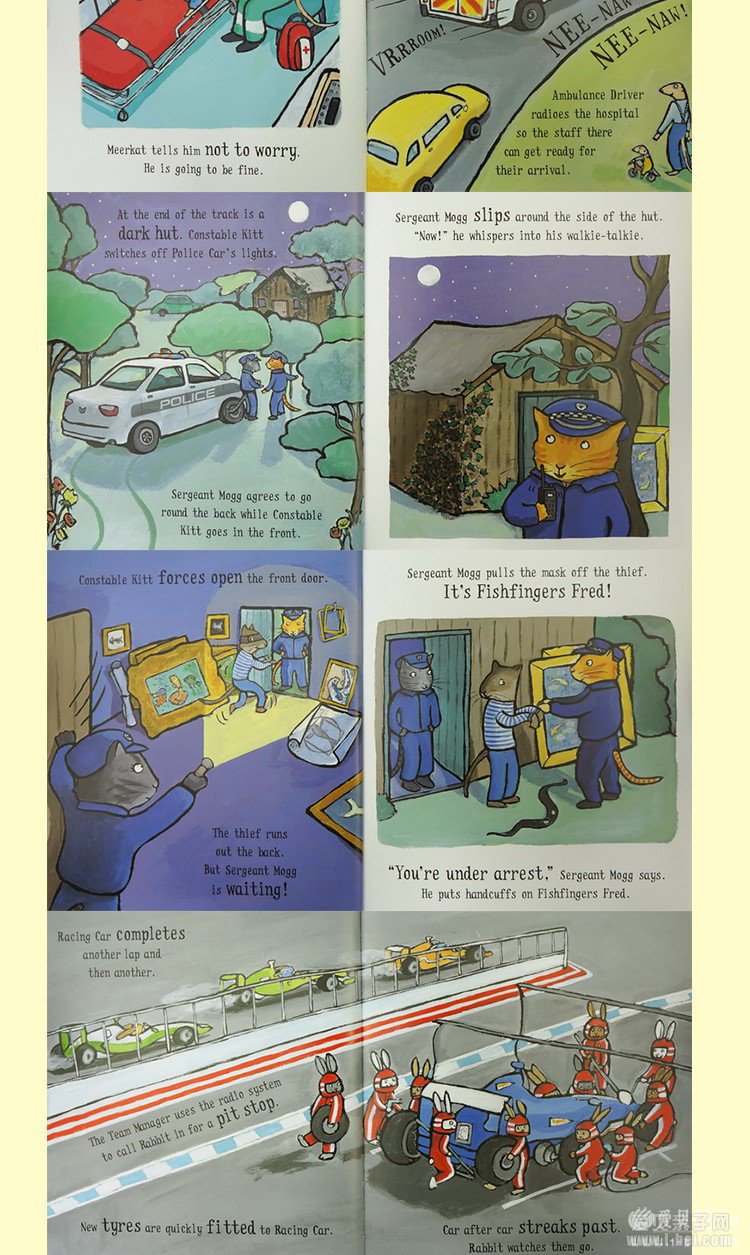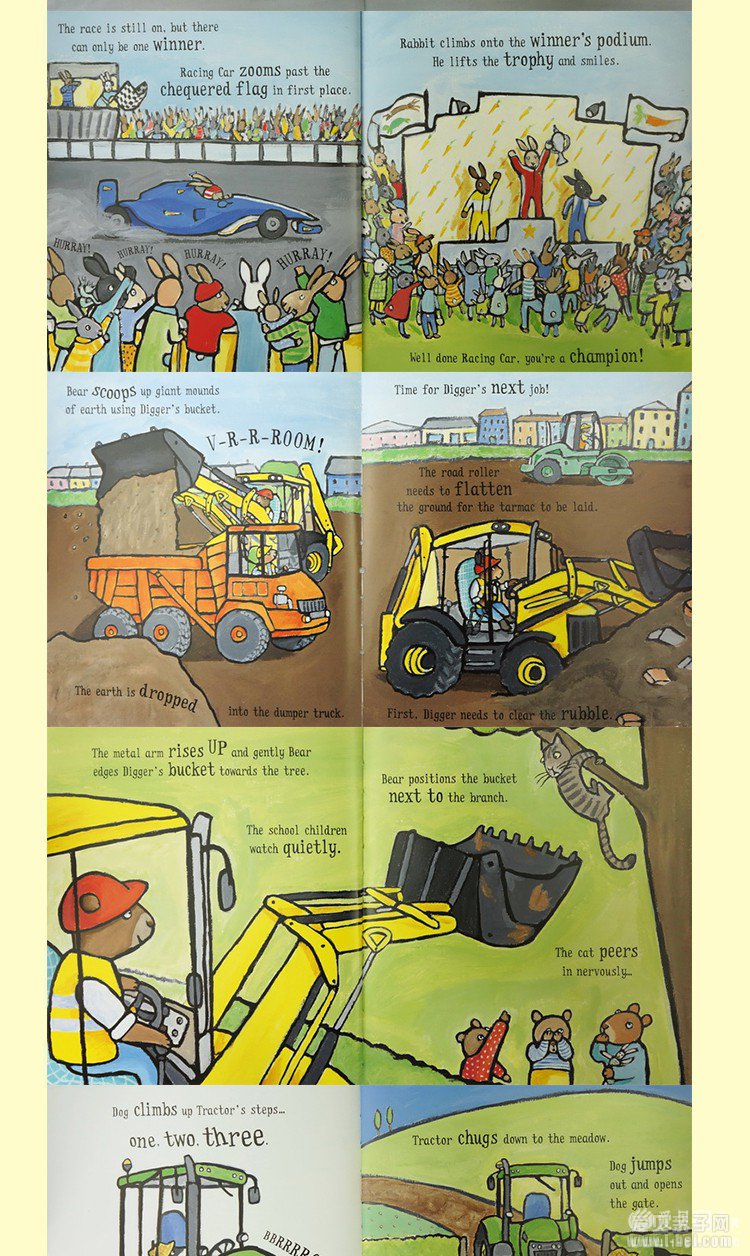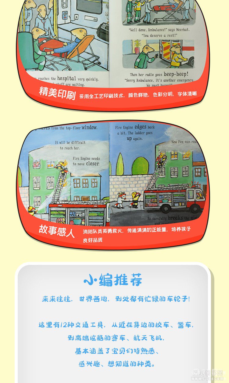在每本书的结尾,还对所介绍的车辆进行了简明扼要的综述,清楚标示了车辆的各个零部件,并介绍其他相关的车辆和机器等。绘本方式的画面特点具有很强亲和力,且书中的谈话提示鼓励家长与孩子们进行更深一步的讨论和探索活动,是一本老少皆宜的科普读物。