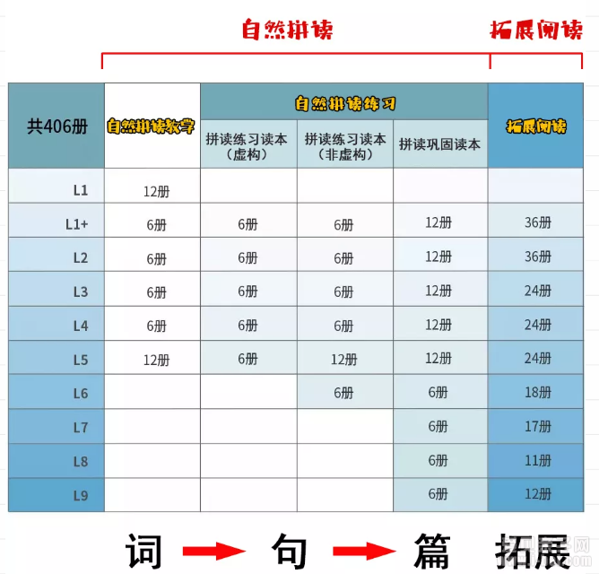 学校版体系庞大,分级非常严谨。依据英国国家课程教学标准,语句经过专业的团队特别设计,难度由浅入深。整个系列从儿童阅读前的准备行为,到早期的自然拼读学习,再发展到更多更复杂文字的阅读和理解,囊括了整个儿童阅读发展过程。