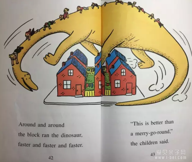 “他们在那里,”丹尼说。“为什么,这是骑在恐龙上面的丹尼,”一个小孩说。“可能他会乘我们一趟。”