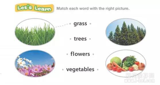 上面的重点词汇是grass、trees、flowers、vegetables