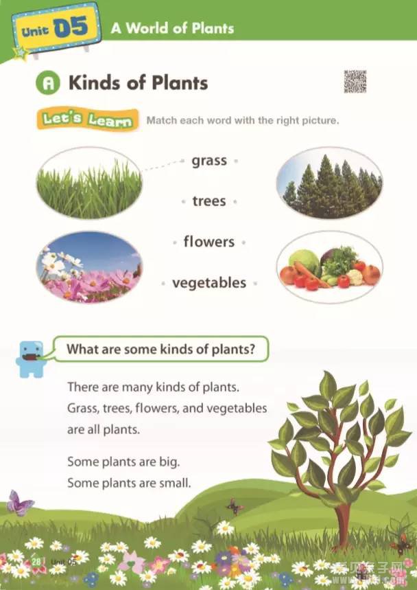 课本对植物进行了分类,植物分为grass(草)、Trees(树)、Flowers(花)和Vegetables(蔬菜)。