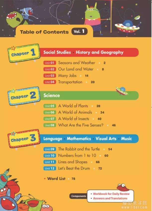 这套《美国幼儿园课本》的课程设计让孩子在纯英文的环境中,学习语言、数学、自然科学、社会科学、历史、地理、音乐、艺术等学科。