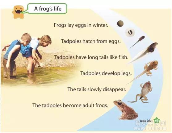 在pre-K2中的 Frogs Grow and Change中,蝌蚪的样子,青蛙的样子以及从蝌蚪到青蛙一步步的变化过程,都用了大量真实图片来展示。